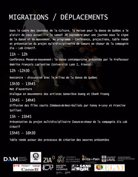 Pour les Journées de la culture, le 28 septembre, la Maison pour la danse de Québec vous invite à son événement « Migrations / déplacements ». Au programme : Conférence, projections, table ronde et présentation du projet multidisciplinaire de Coeurs en choeur de la compagnie Zia – Lab créatif.