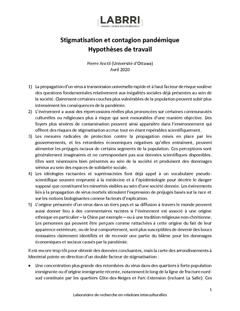 Le texte de Pierre Anctil aborde la stigmatisation de certaines communautés dans l’épidémie actuelle. Il aborde notamment les facteurs de risque qui font que certaines communautés sont plus vulnérables au virus, ainsi que les répercussions de ce fait sur les préjugés, la stigmatisation et le racisme.