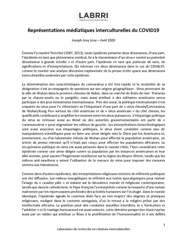 Le texte de Joseph Josy Lévy aborde les représentations médiatiques et interculturelles du COVID-19. L’auteur aborde l’épidémie non seulement comme phénomène médical, mais aussi comme porteuse de sens, de significations et d’interprétations. Il a alors procédé à une analyse discursive exploratoire de la presse écrite en ce qui à trait aux dimensions interculturelles qui apparaissent dans le contexte actuel.