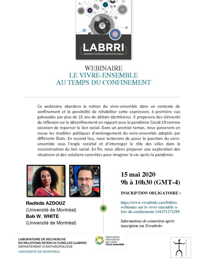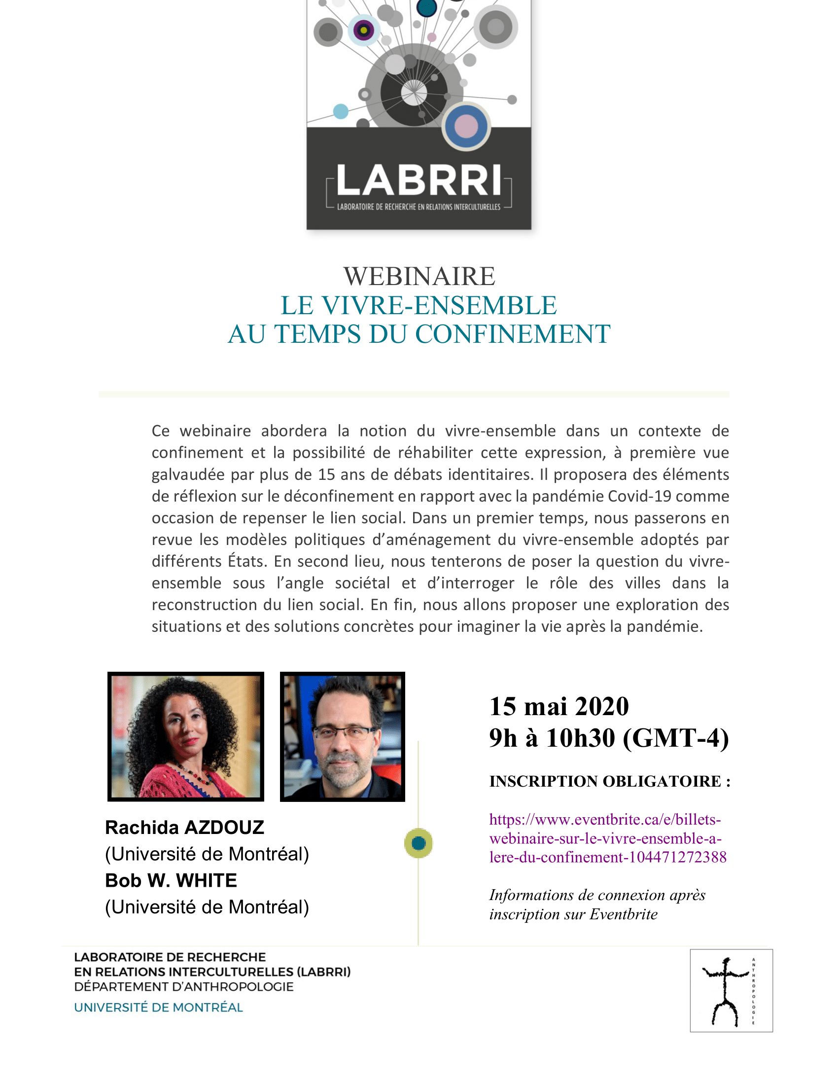 Nous sommes heureux.ses de vous inviter au webinaire « Le vivre-ensemble au temps du confinement ». Celui-ci, animé par Rachida Azdouz (UdeM) et Bob White (UdeM), s’adresse aux chercheur.e.s et aux professionnel.le.s qui travaillent dans le domaine de l’inclusion à Montréal, comme ailleurs.