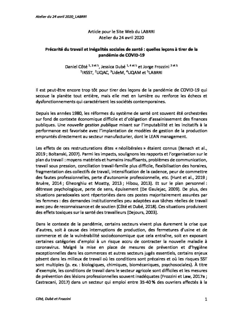 Le 24 avril dernier, le LABRRI a organisé un atelier sur le travail et la précarité. C’était le troisième atelier d’une série de rencontres dédiées au contexte actuel de pandémie et de confinement. L’atelier a été animé par Jorge Frozzini, Jessica Dubé et Daniel Côté. Suite à cet atelier – et aux discussions qui en ont suivi – ceux-ci ont écrit un texte :