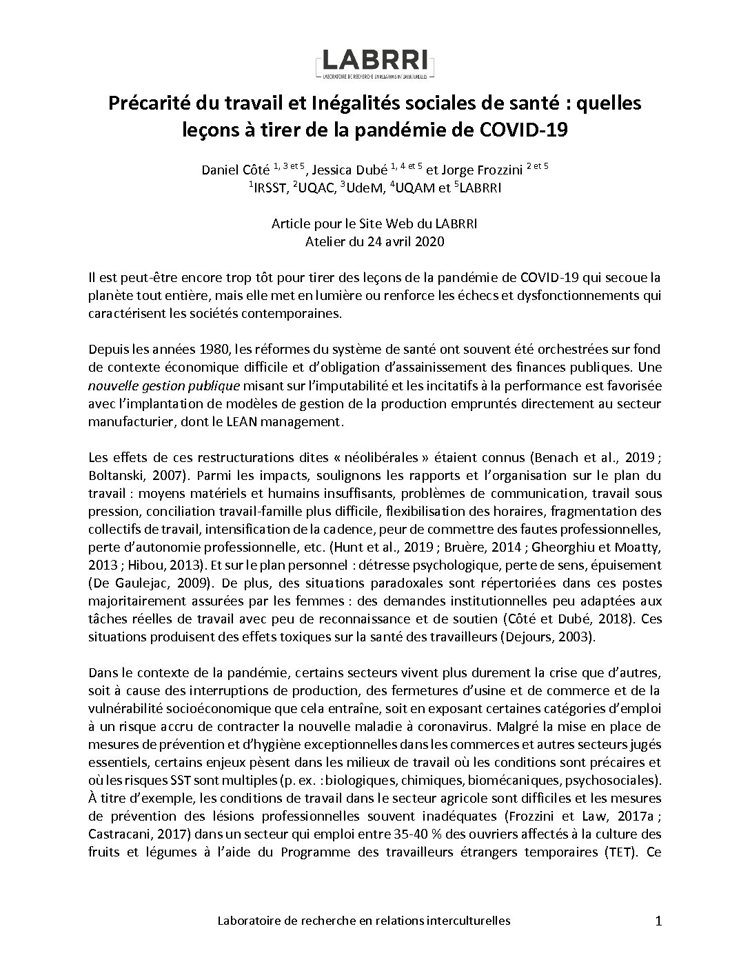 Gravel, S., et Dubé, J. (2016). Occupational health and safety for workers in precarious job situations: combating inequalities in the workplace. E-Journal of International and Comparative Labour studies. 5(3).