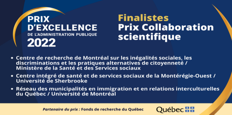 Le Réseau des municipalités en immigration et en relations interculturelles du Québec (RÉMIRI) et le Laboratoire de recherche en relations interculturelles (LABRRI) de l’Université de Montréal sont fiers d’annoncer qu’ils ont été choisis comme finalistes pour le Prix d’Excellence de l’administration publique par l’Institut de l’Administration Publique du Québec (IAPQ), dans le cadre du concours “collaboration scientifique”. Le RÉMIRI s’est démarqué par la qualité de son dossier de candidature et par son mode de gouvernance inédit qui repose sur une collaboration étroite entre les professionnel.le.s du secteur municipal et le milieu de la recherche (LABRRI).