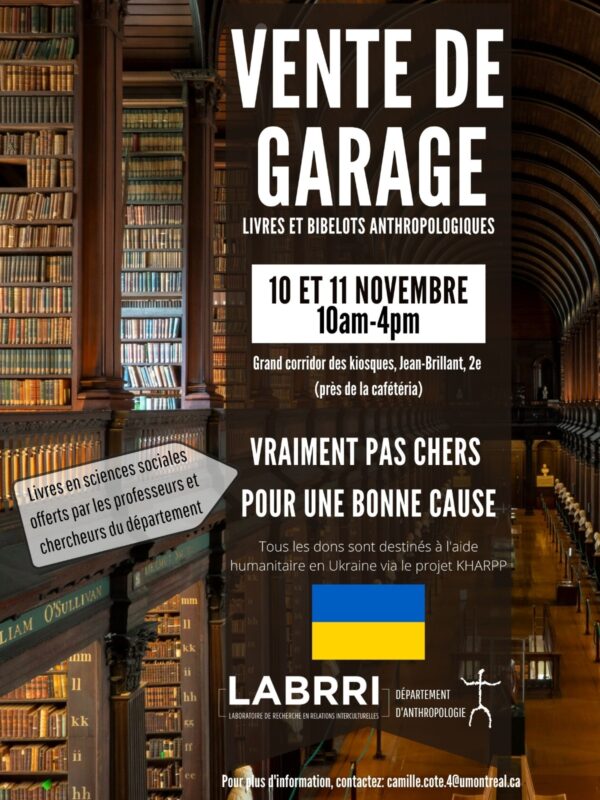 Le Laboratoire de recherche en relations interculturelles (LABRRI) et le Département d’anthropologie de l’Université de Montréal sont heureux d’annoncer une vente de garage de livres et de bibelots anthropologiques. Tout le monde est invité(e) à explorer les collections et dénicher la perle rare parmi les livres, manuels et bibelots généreusement contribués par les professeurs et les diplômés du Département d’anthropologie.
