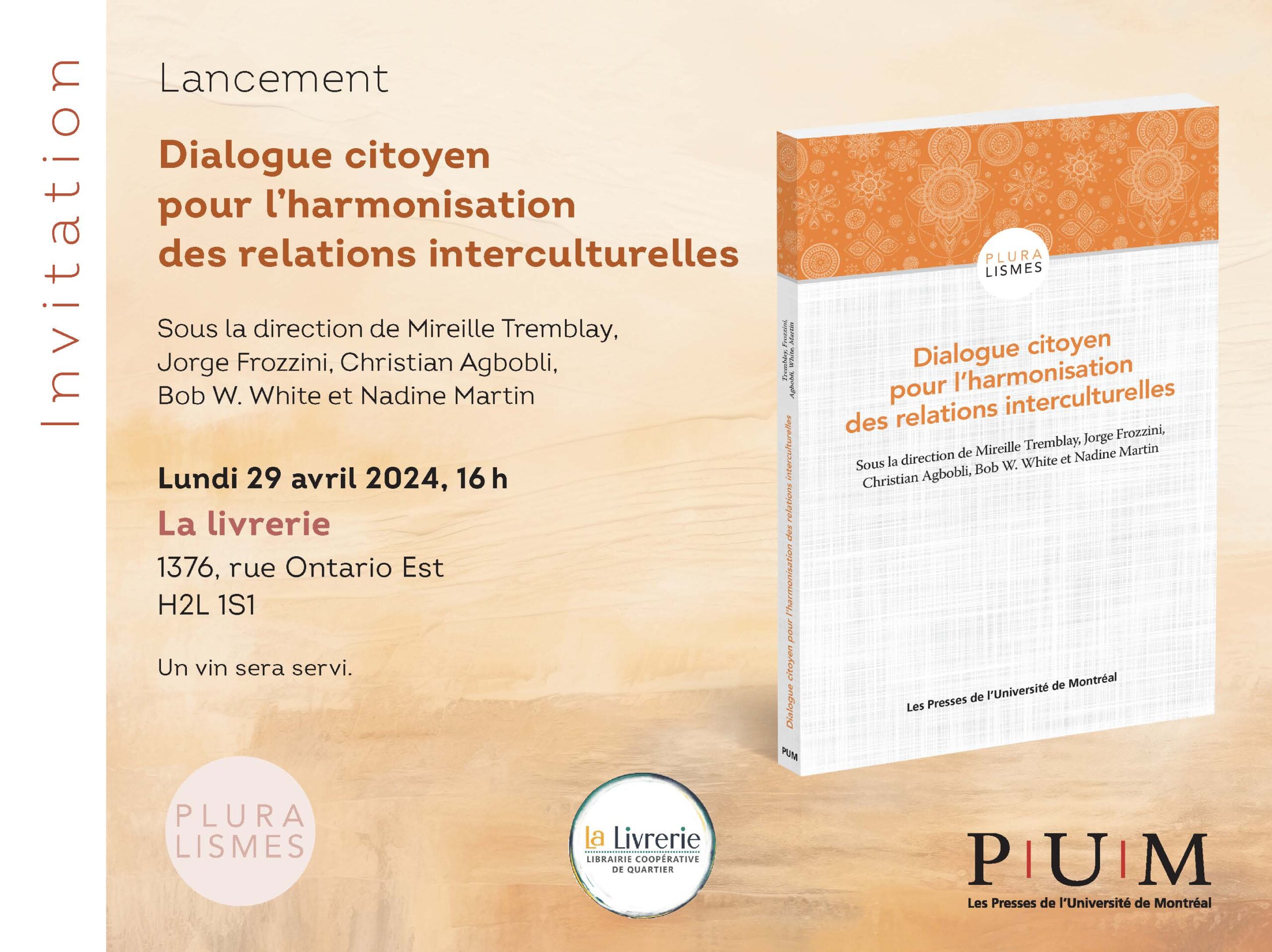 L’équipe du LABRRI souhaite porter à votre attention la publication toute récente de l’ouvrage Dialogue citoyen pour l’harmonisation des relations interculturelles publié aux PUM sous la direction de Mireille Tremblay (UQAM), Jorge Frozzini (UQAC), Bob W. White (Université de Montréal) et Nadine Martin (UQAM). Nous y soulignons aussi la contribution du chercheur affilié du LABRRI, Jérôme Pruneau ainsi que de deux doctorantes, Émilie Tremblay (UQAM) et Isabelle Comtois (Université de Montréal).