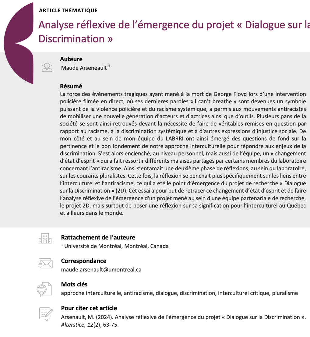 Maude Arsenault signe un article pour la revue Alterstice: «Analyse réflexive de l’émergence du projet « Dialogue sur la Discrimination »».