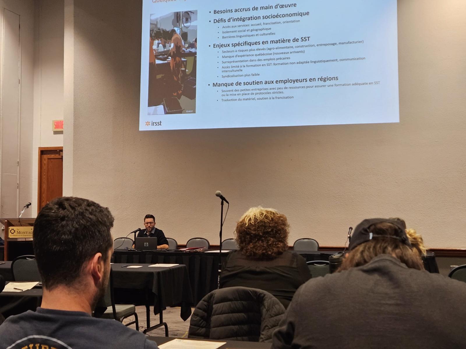 De son côté, Daniel a présenté sur les défis d’inclusion des personnes immigrantes en SST au Québec, particulièrement en région, incluant la précarité de l’emploi, la surqualification et le manque de formations adaptées aux réalités linguistiques et culturelles. Il a ainsi pu mettre en relief que l’accès limité aux ressources, le faible soutien des petites entreprises non syndiquées et la forte concentration dans des industries à risque (agroalimentaire, transport, hôtellerie, commerce, manufacturier) exacerbent ces enjeux, mais aussi que les lésions professionnelles sont souvent sous-déclarées, faute de connaissance des droits ou en raison de pressions dissuasives.