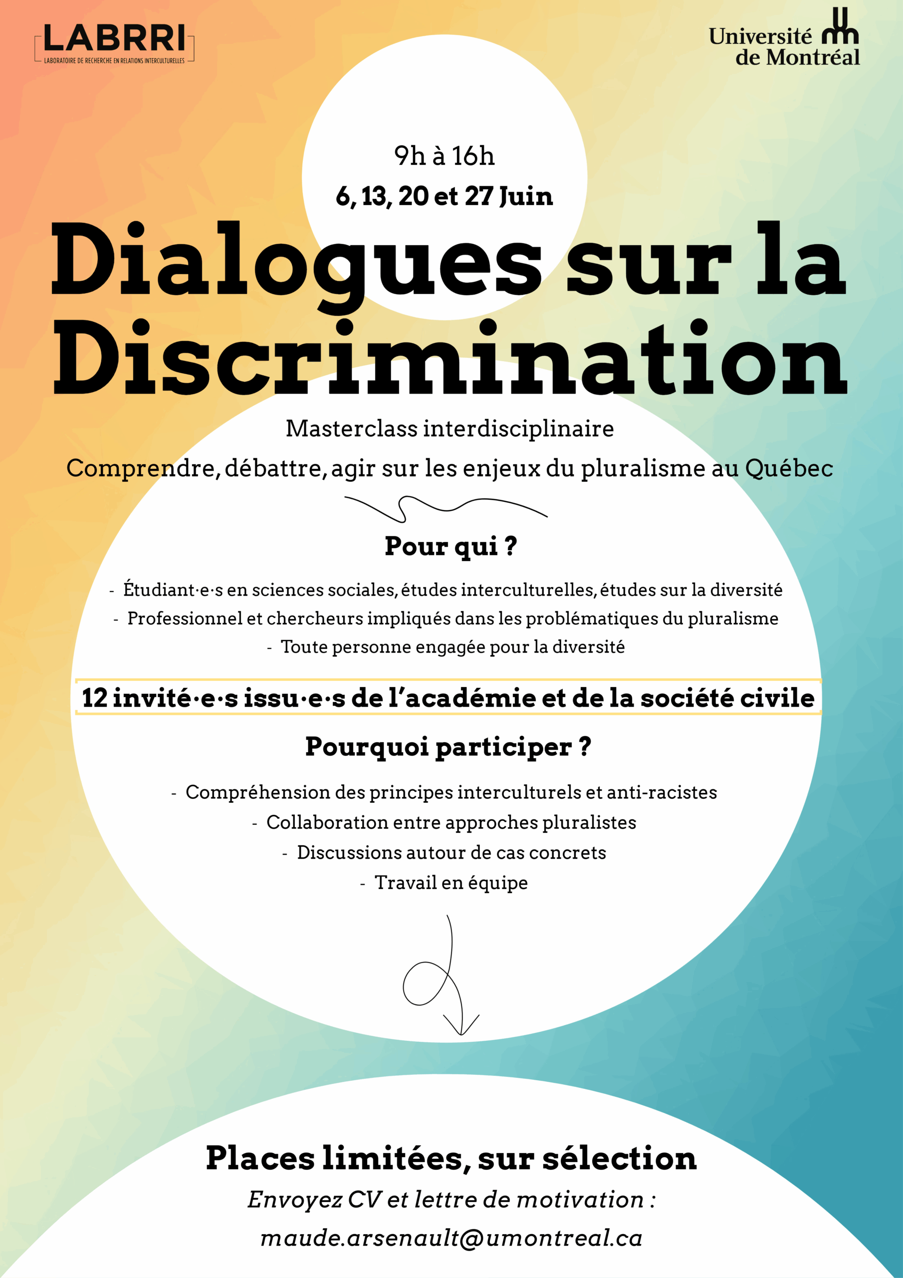Depuis 2021, l’équipe du Laboratoire de recherche sur les relations interculturelles (LABRRI) explore les tensions, convergences et complémentarités entre deux grandes approches de la pensée pluraliste au Québec : l’interculturalismeet l’antiracisme. Dans le cadre de notre projet – Dialogues sur la discrimination – des chercheurs, praticiens et activistes issus de ces deux courants ont été réunis pour nourrir un dialogue inédit sur les façons de penser et de construire une société plus juste.