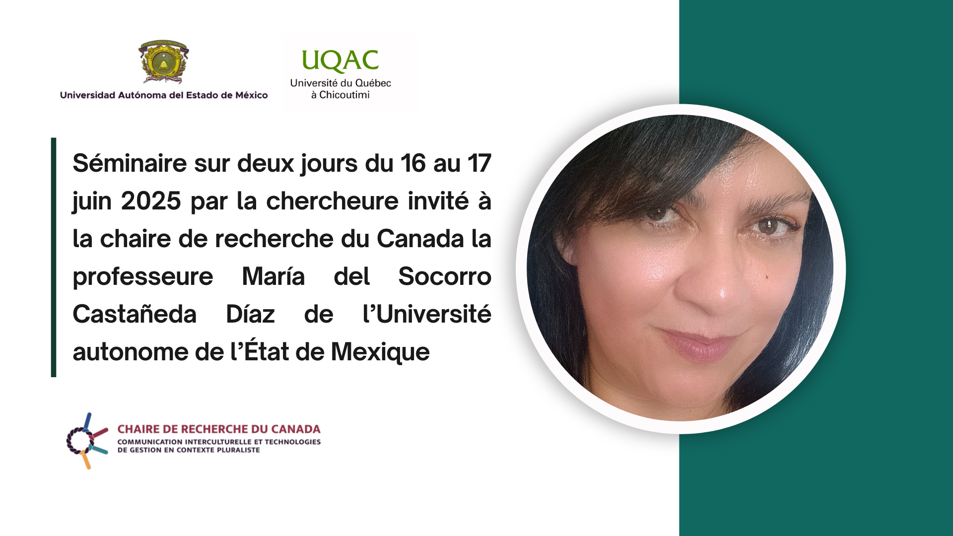La chaire de recherche du Canada en communication interculturelle et technologies de gestion en contexte pluraliste organise un séminaire en deux temps, animé par la professeure María del Socorro Castañeda Díaz, de l’Université autonome de l’État de Mexico.
