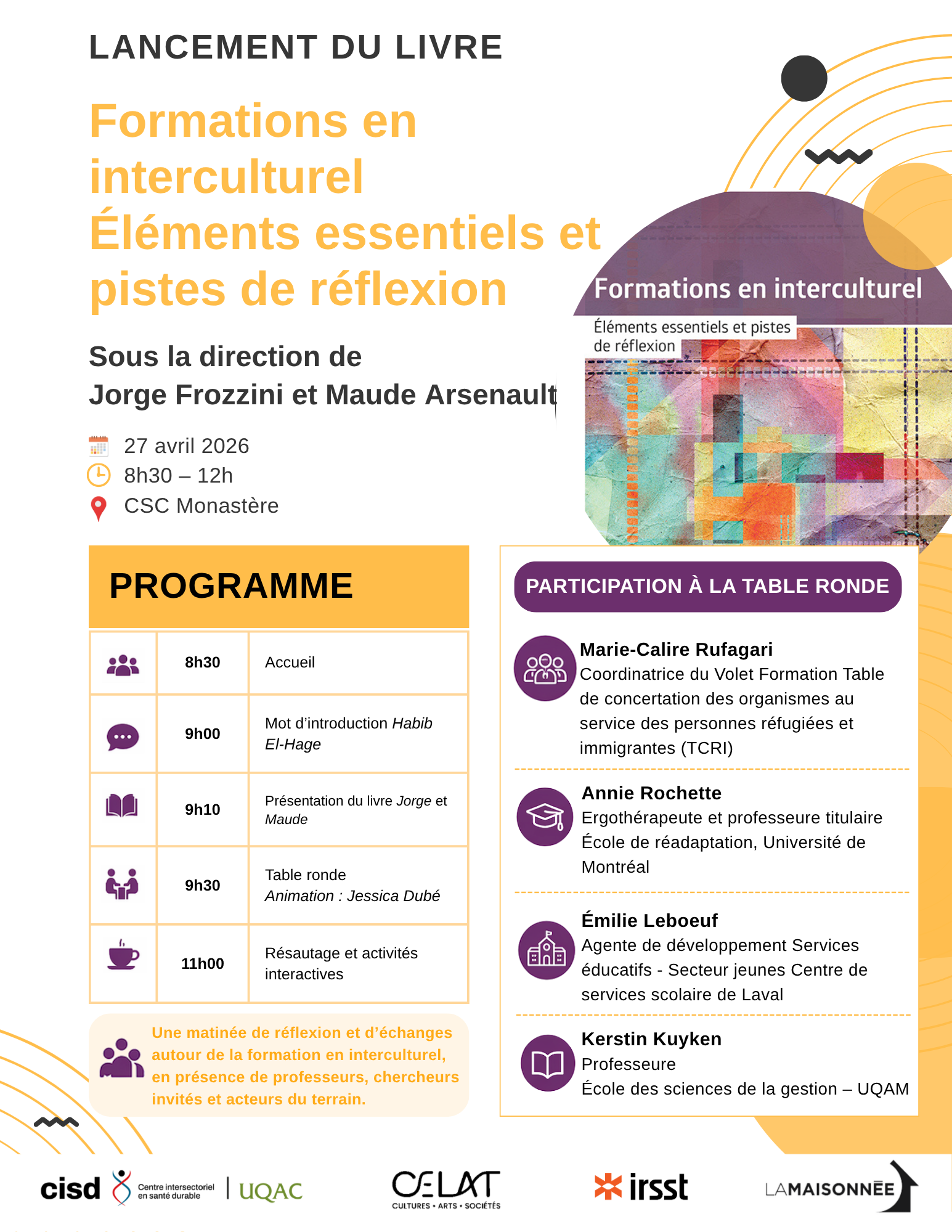 Le 27 avril 2026, le CSC Monastère à Montréal accueillera une matinée de réflexion et d’échanges organisée à l’occasion du lancement de l’ouvrage Formations en interculturel – Éléments essentiels et pistes de réflexion, dirigé par Jorge Frozzini et Maude Arsenault. L’événement réunira des chercheuses, des chercheurs et des acteurs du terrain afin de discuter des enjeux contemporains liés à la formation en contexte interculturel.